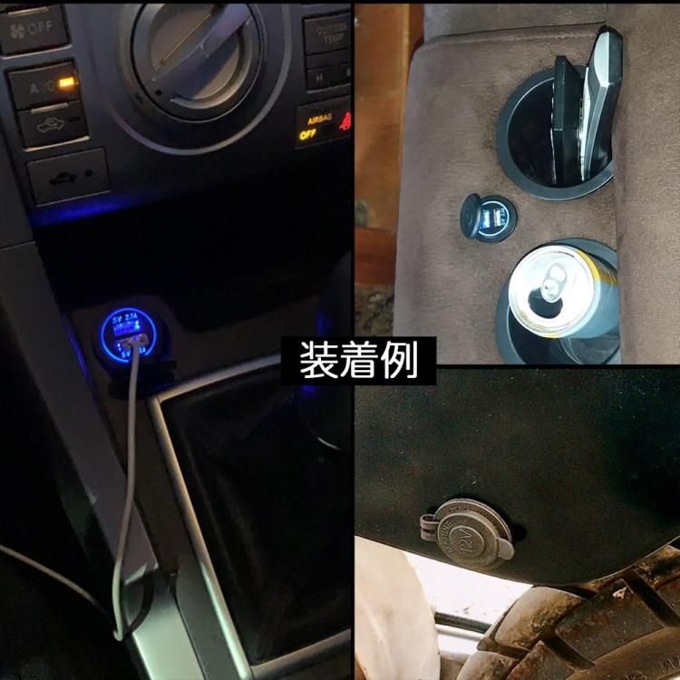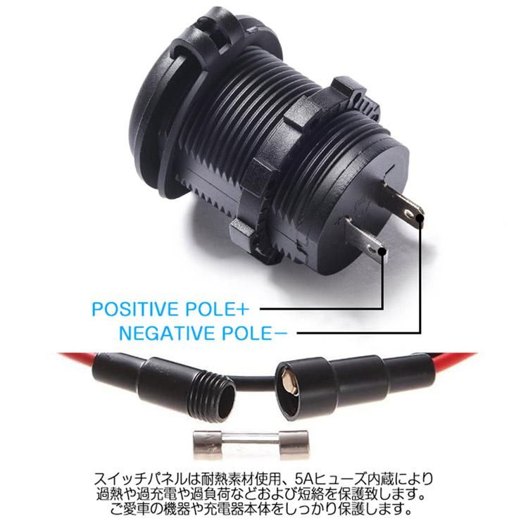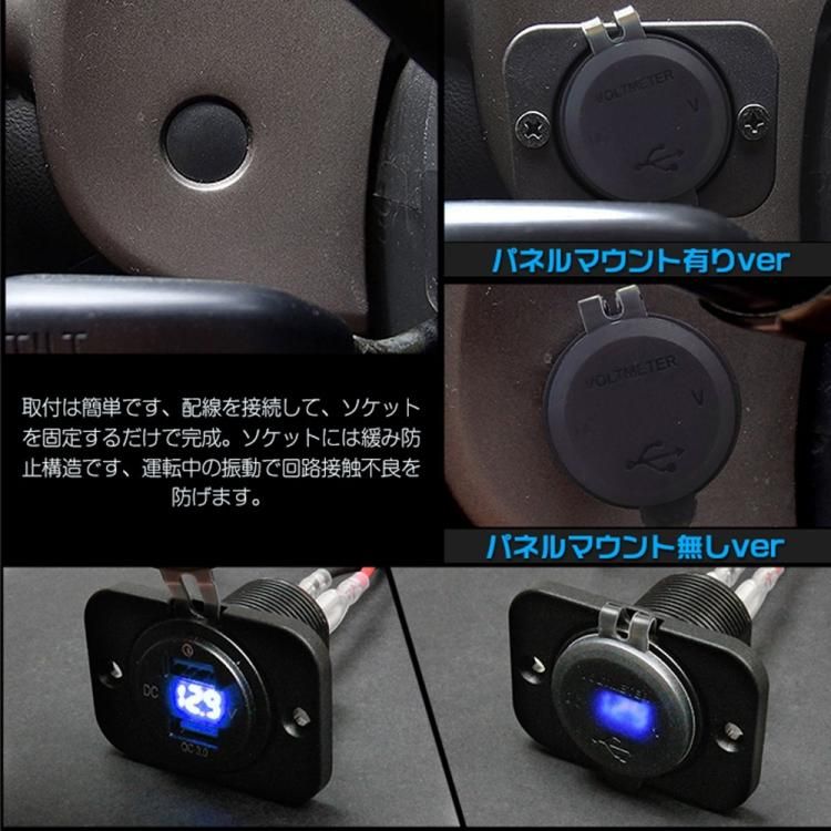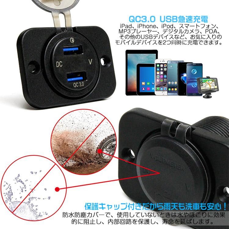 QC3.0急速充電増設USBポート(2個)+シガーソケット+青LED電圧計+スイッチ付き 4in1増設ソケット 12/24V車用や船舶等に