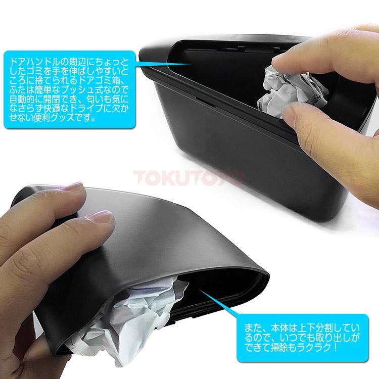 ■ドアハンドルの周辺にちょっとしたゴミを手を伸ばしやすいところに捨てられるドアゴミ箱、ふたは簡単なプッシュ式なので自動的に開閉でき、匂いも気になさらず快適なドライプに欠かせない便利グッズです。