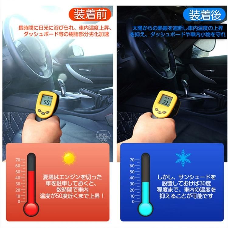 ■紫外線をカット:フロントサンシェードを装着することで紫外線をカットされ、ダッシュボードを守り、劣化防止も効果有り。