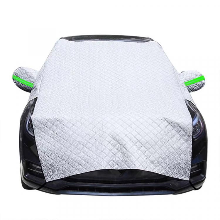 ■表面素材はPEVAアルミ箔+PE不織布。2重厚手構造の車保護カバーです。車のボンネット、フロントガラス、バックミラーをカバーすることができます。車のフロントガラスやボンネットを雪、雨、霧、氷から守ります。裏面は不織布で、車を傷つけません。紫外線を遮断し、ワイパーやサイドミラーやフロントガラスの寿命を効果的に延ばし、夜間の霜の発生を効果的に防ぎます。