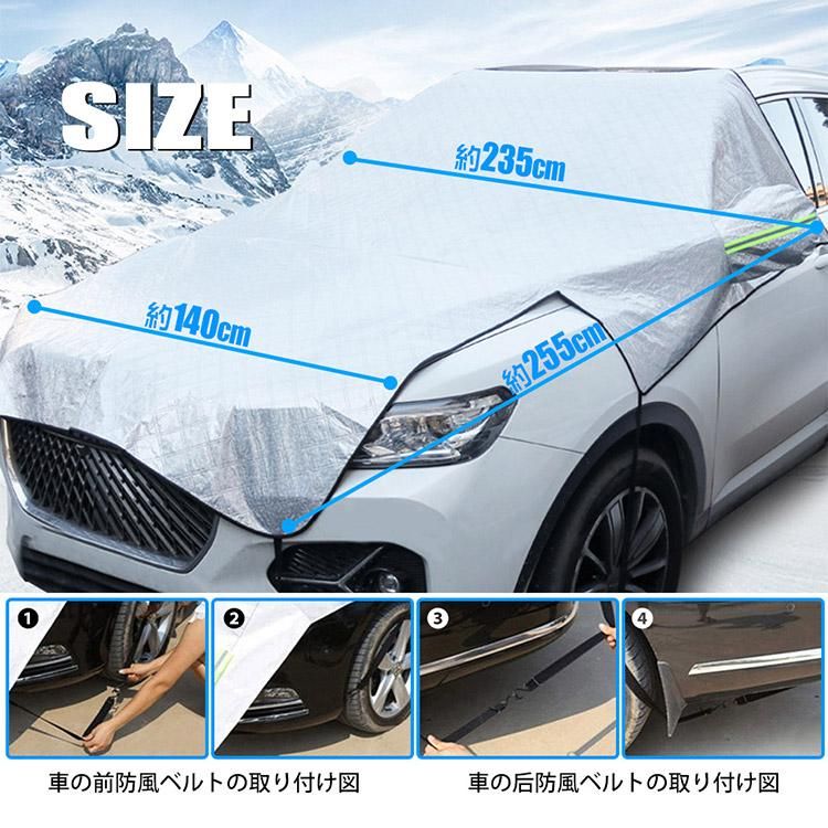 ■商品内容とサイズ: ?車用フロントガラスカバー1枚+?収納袋1枚。サイズ:縦長245x横幅230(140)cm、重量:0.88kg。