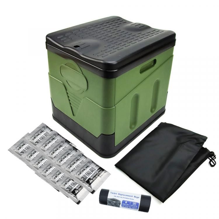 簡易トイレ 携帯トイレ 処理袋20枚付 凝固剤12個付き 防災グッズ 多機能 非常用 防災 車中泊 収納バッグ付属折りたたみ式 (グリーン)