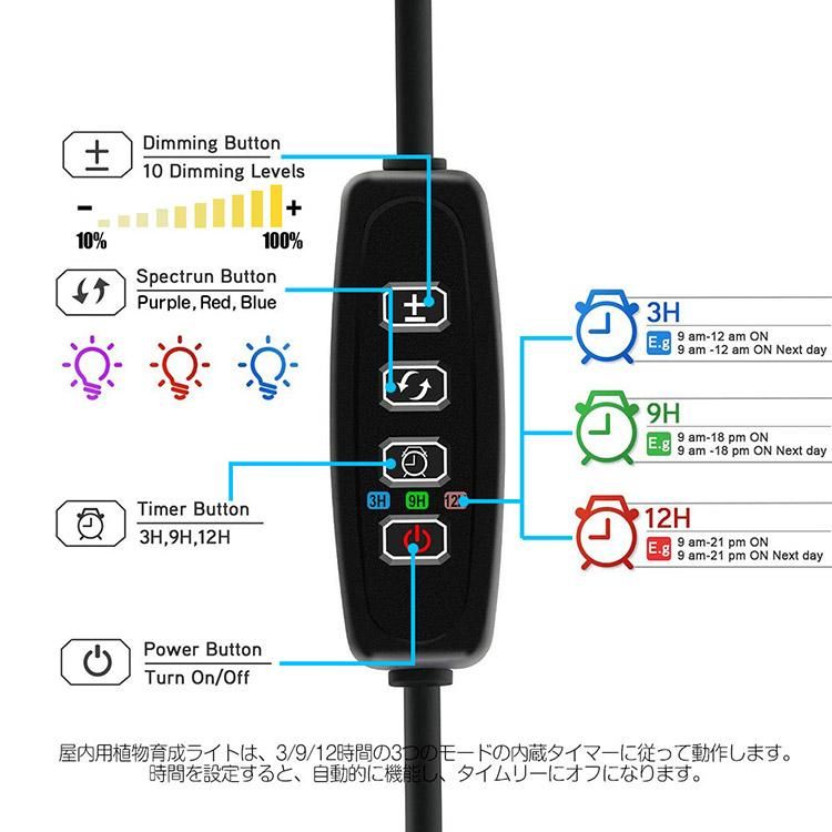■3ヘッド式植物ライト10段階照明調光機能、光切り替え機能、タイマー機能の3つの機能を搭載。