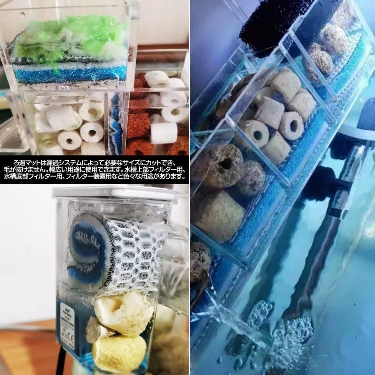 ■ ブルーのフィルター綿:鮮やかなブルーのフィルター綿は、視覚的にも美しく、目立たず水槽内に溶け込みます。高密度の素材が高いろ過効果を発揮します。