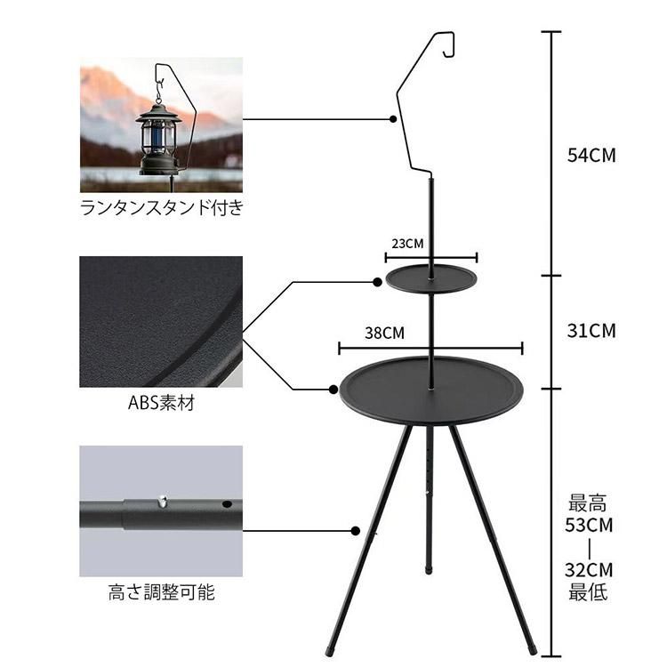 折りたたみテーブル 軽量 コンパクト 丸型 アウトドア ソロキャンプ 焚き火テーブル 高さ調節可能 ランタンスタンド付(直径38cm/23cm ABS製天板)