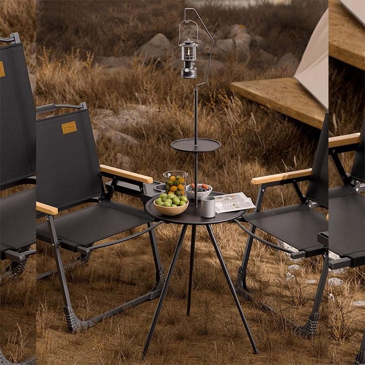 ■このテーブルは、キャンプやアウトドア活動に最適な軽量かつコンパクトな設計です。天板はABS素材を使用しており、耐久性が高く、汚れや傷がつきにくい特徴があります。ランタンスタンド付きで、夜間の使用にも便利です。