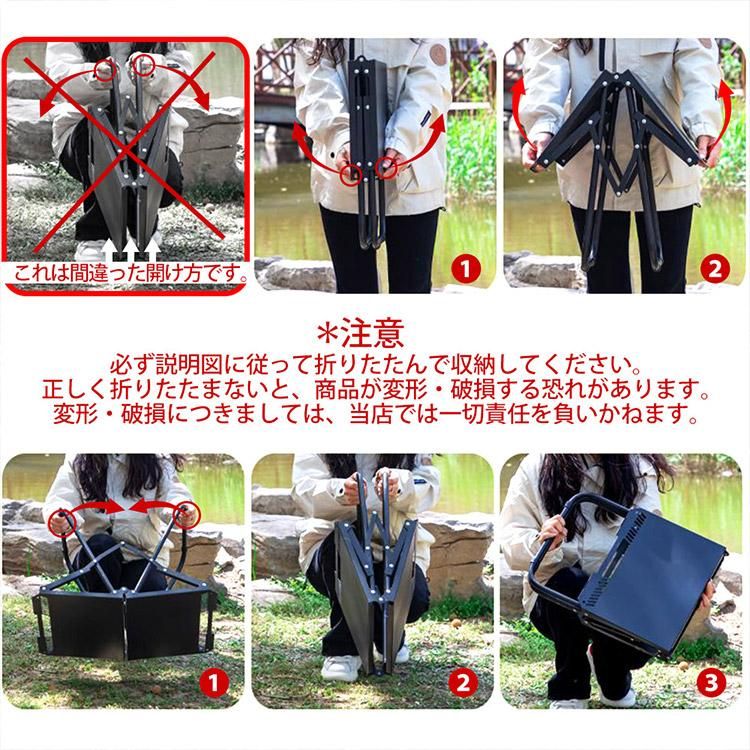 ■黒色のタクティカルテーブルは高炭素鋼素材を採用しており、非常に頑丈で耐久性に優れています。約60kgの荷重に耐えられる構造で、大人が体重をかけても安定して使用できます。また、一秒で折りたたむことができる設計により、収納や持ち運びも簡単で、アウトドアや車中泊に最適です。