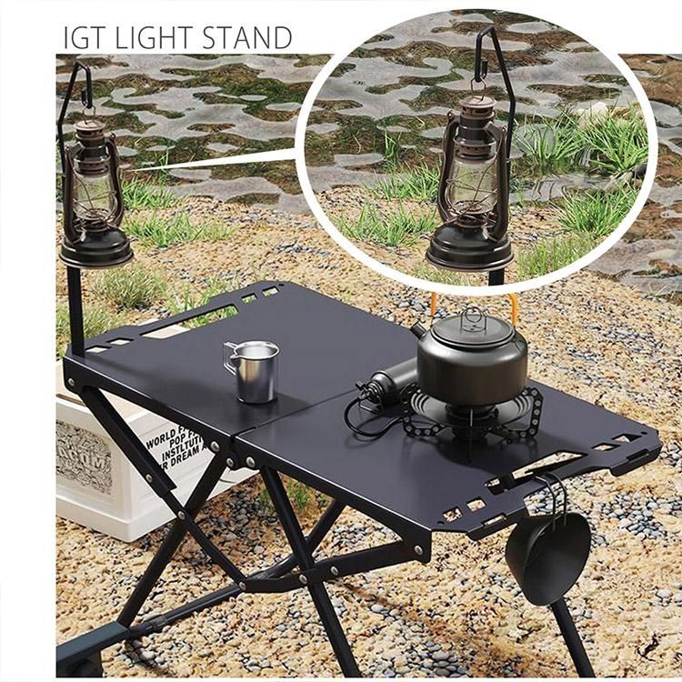 ■付属のランプスタンドは、夜間のキャンプ活動を快適にサポートする便利なアイテムです。LEDランタンやフック付きライトを吊るせば、テーブル全体を明るく照らすことができ、調理・食事・ゲーム・読書などあらゆるシーンで活躍します。