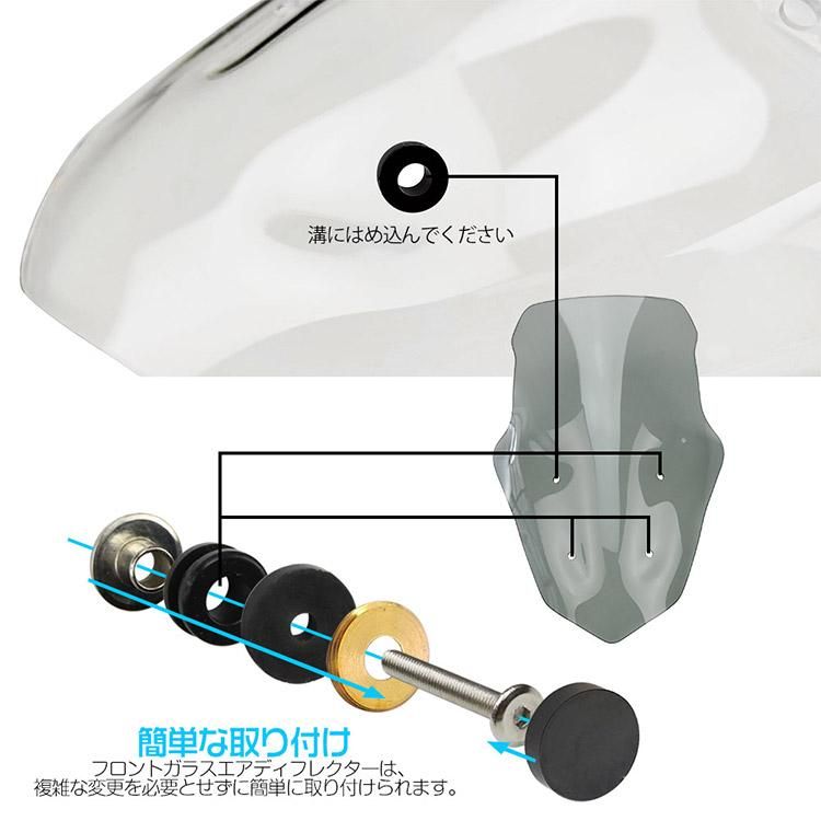 ■厚みがあるため、高速振動を吸収し、ひび割れや傷を防ぎます。付属のゴムパッキンやキャップとボルトで純正スクリーンとそのまま入替え交換できます。