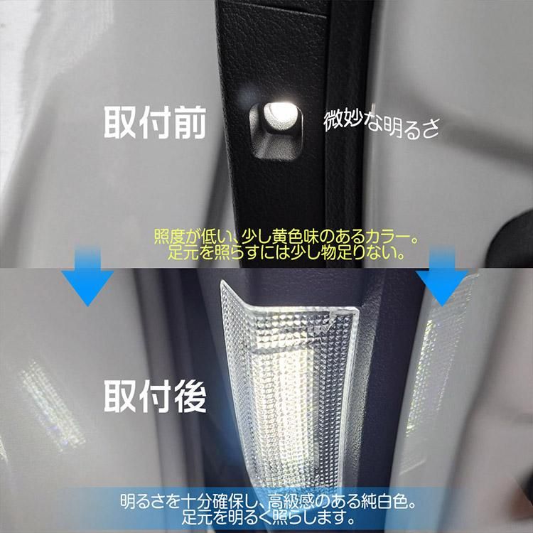 ■【車種専用設計】車種専用設計なので純正のLEDを外して交換するだけの簡単取付です。純正の光より明るく澄み切った純白色の光に変えます。純正ランプをはるかに超える明るさを実現しました。ドアを開けるときに、足元をより明るく照らします。